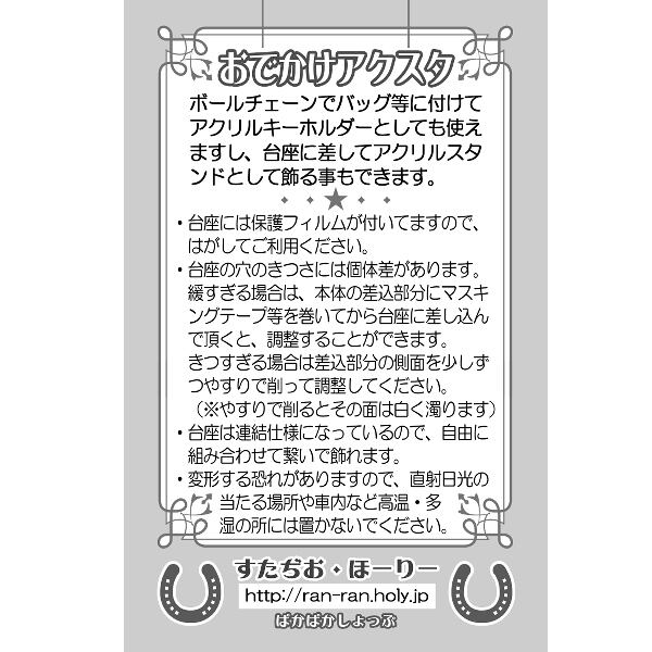※注意※『新・おでかけアクスタ』は従来の『おでかけアクスタ』とは本体差し込み部分と台座の差し込み口の形状が違うため、新旧の本体と台座を入れ替えての使用はできません。また、新バージョンの台座にはボールチェーンを通す穴は開いておりません。